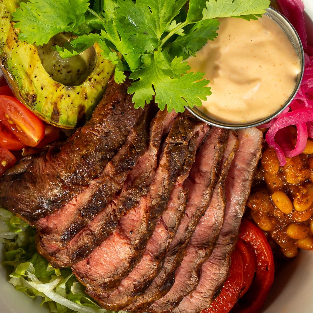 cajun seared AAA steak, grilled half avocado, smoked brisket chili, brown rice, shredded lettuce, roasted peppers, diced tomatoes, pickled onions, chipotle dressing